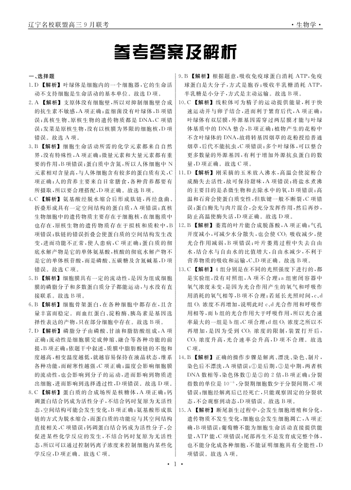 辽宁省名校联盟2024年高三9月份联合考试+生物答案