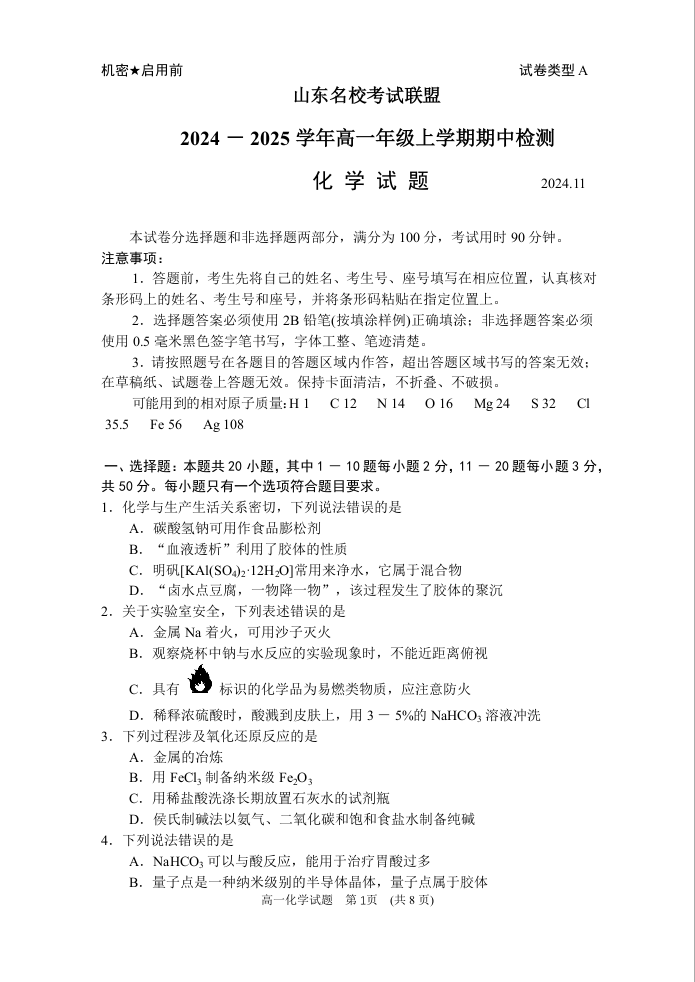 山东省济南名校考试联盟2024.11高一年级上学期期中检测化学