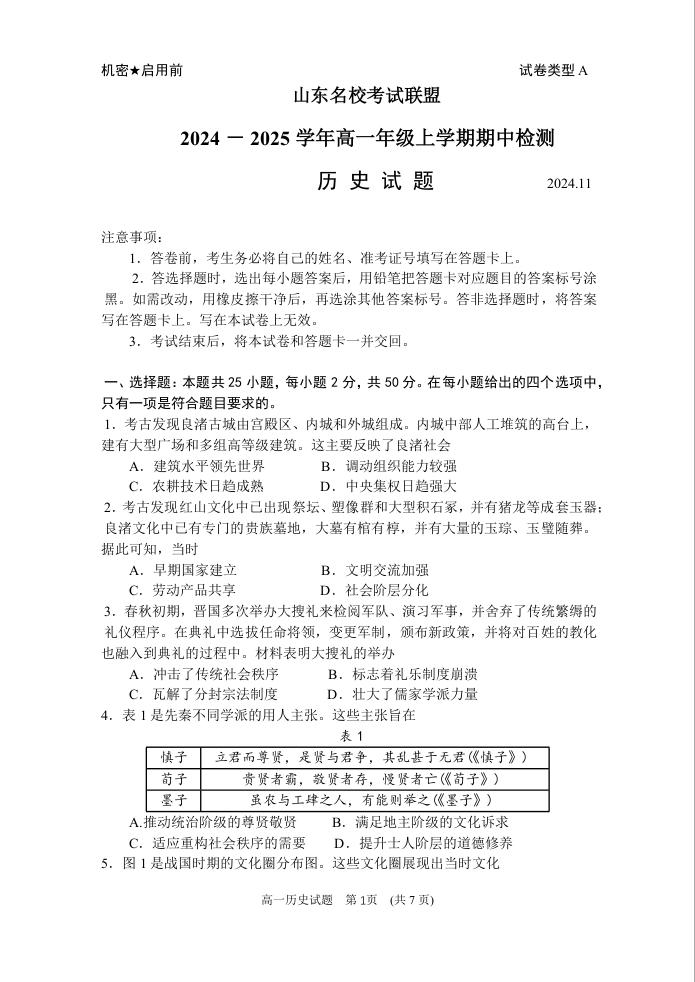 山东省济南名校考试联盟2024.11高一年级上学期期中检测历史
