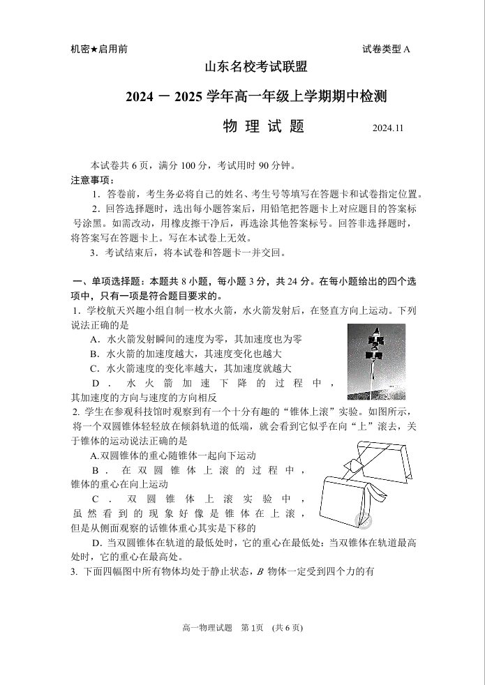 山东省济南名校考试联盟2024.11高一年级上学期期中检测物理