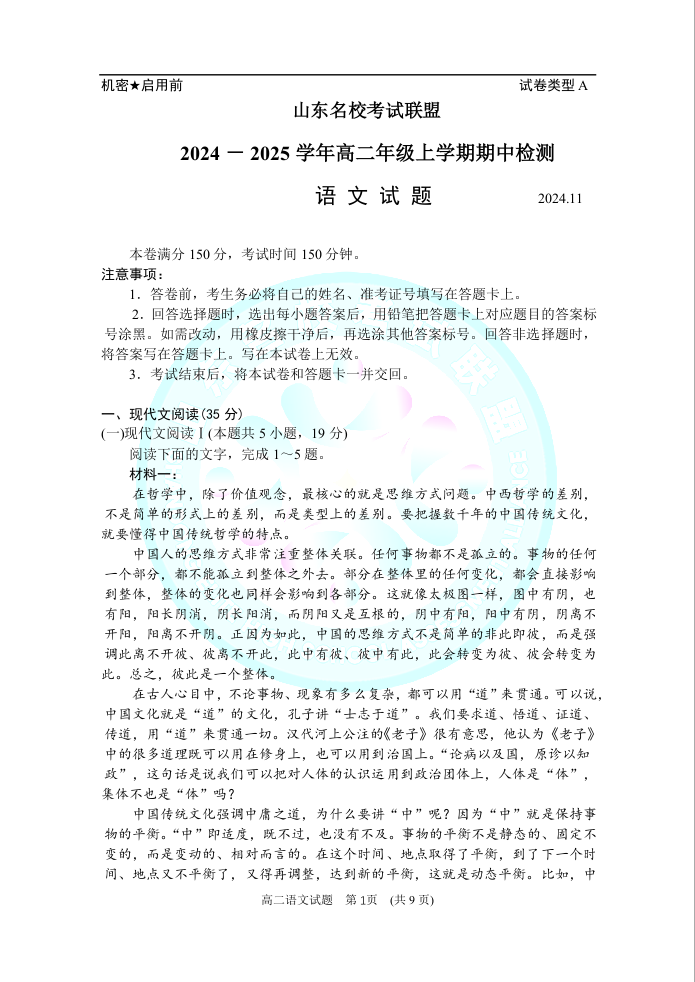 山东省济南名校考试联盟2024.11高二年级上学期期中检测语文