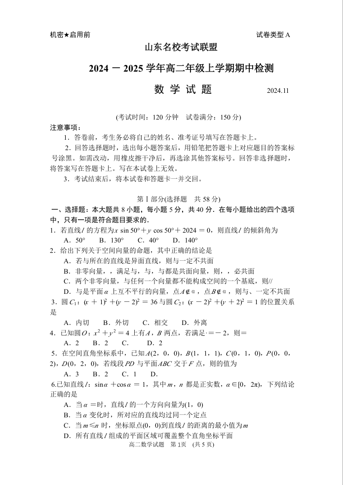 山东省济南名校考试联盟2024.11高二年级上学期期中检测数学