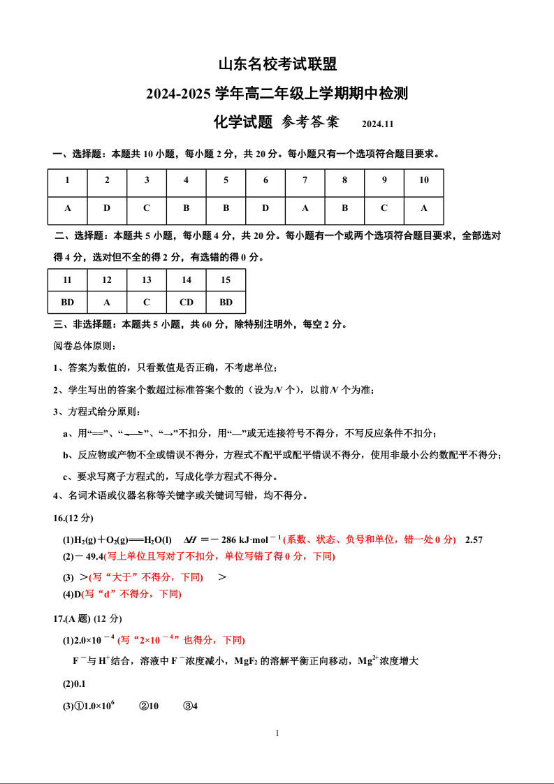 山东省济南名校考试联盟2024.11高二年级上学期期中检测化学答案