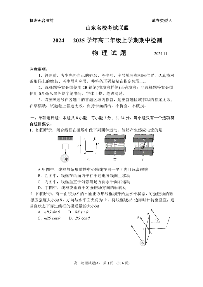 山东省济南名校考试联盟2024.11高二年级上学期期中检测物理A