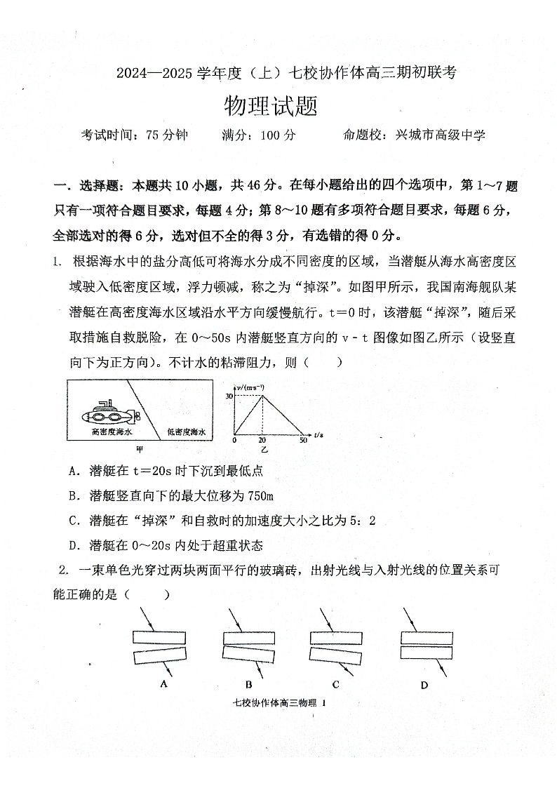 辽宁省2024-2025学年度(上)七校协作体高三期初联考+物理