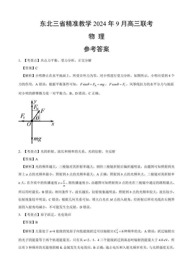 东北三省精准教学2024年9月高三联考+物理答案