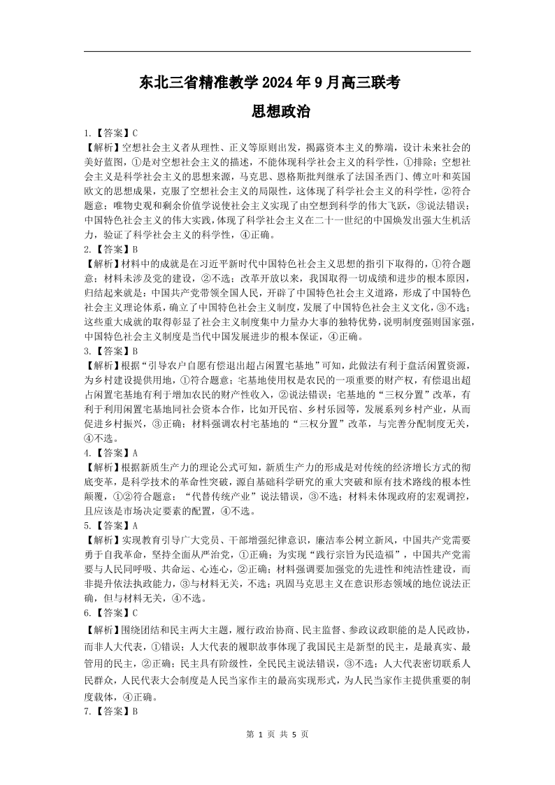 东北三省精准教学2024年9月高三联考+政治答案