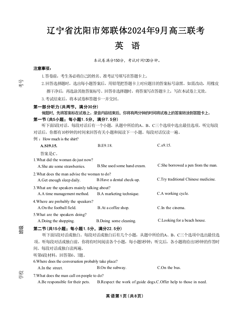 辽宁省沈阳市郊联体2024年9月新高三9月开学联考+英语