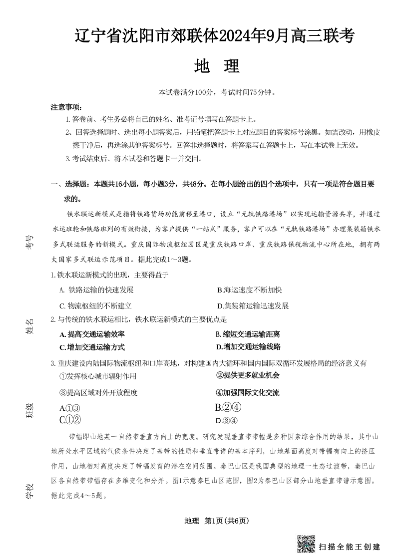 辽宁省沈阳市郊联体2024年9月新高三9月开学联考+地理