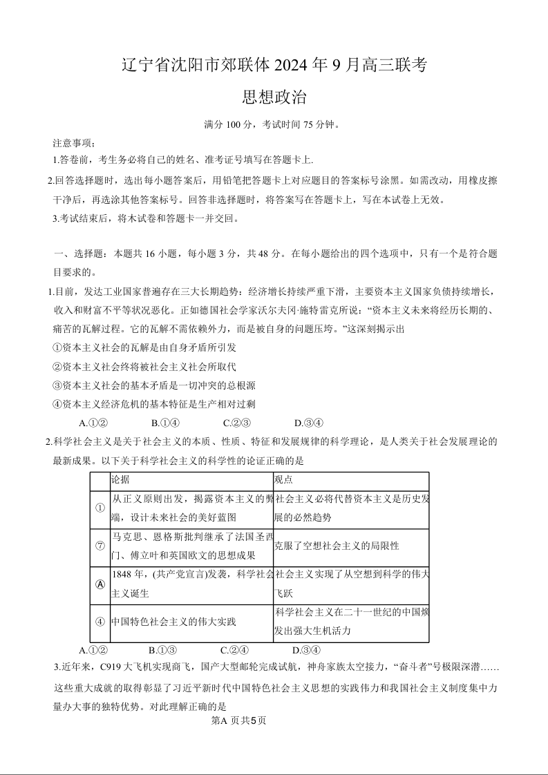 辽宁省沈阳市郊联体2024年9月新高三9月开学联考+政治