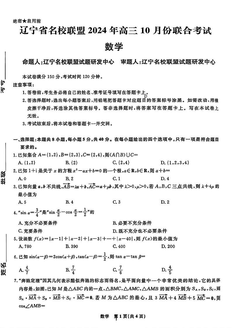 辽宁省名校联盟2024年高三10月份联合考试+数学
