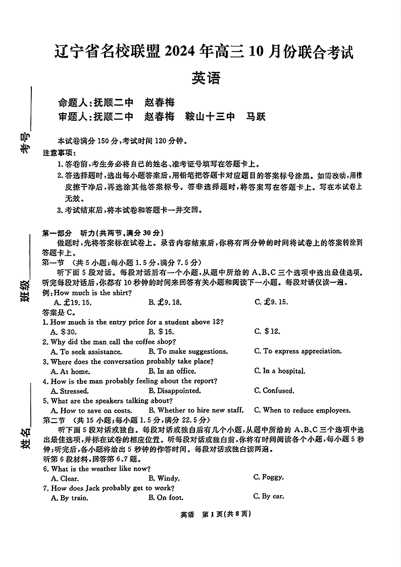辽宁省名校联盟2024年高三10月份联合考试+英语
