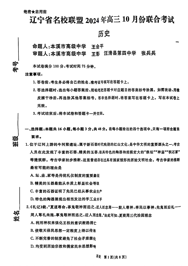 辽宁省名校联盟2024年高三10月份联合考试+历史