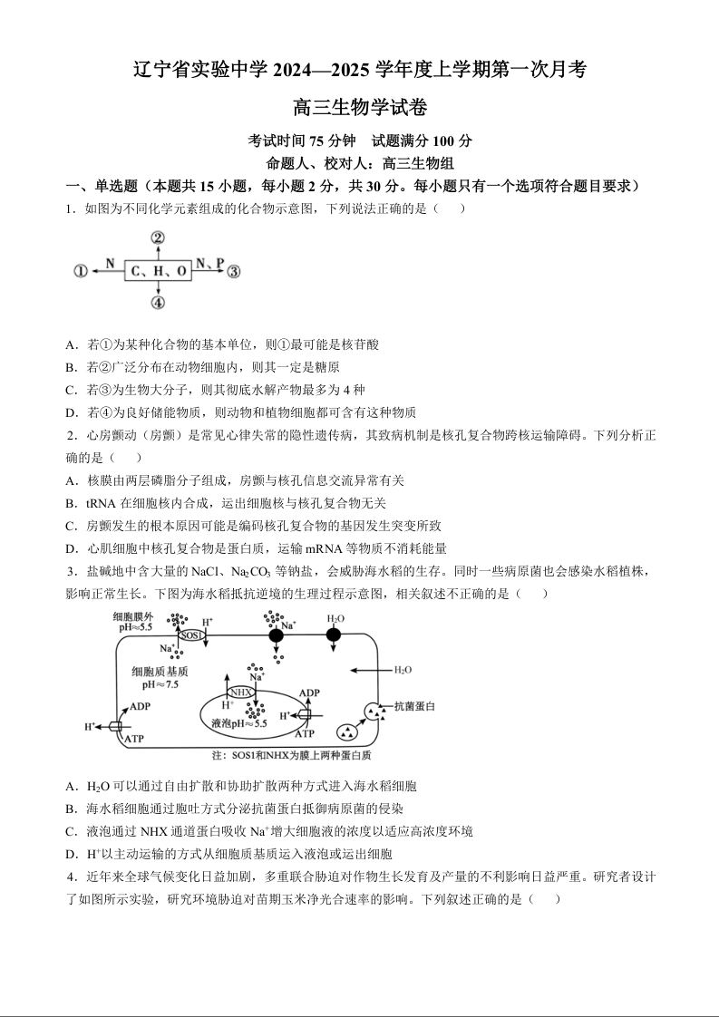 辽宁省实验中学2025届高三上学期第一次月考+生物