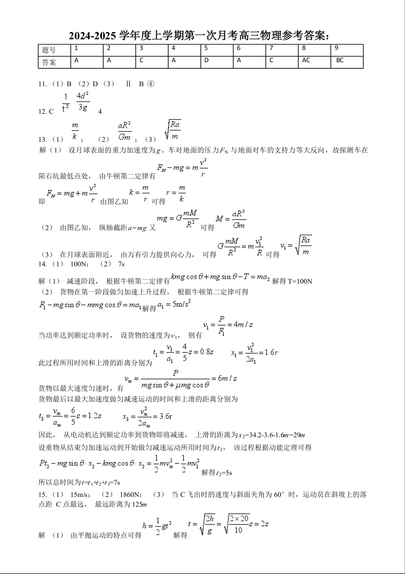 辽宁省实验中学2025届高三上学期第一次月考+物理答案
