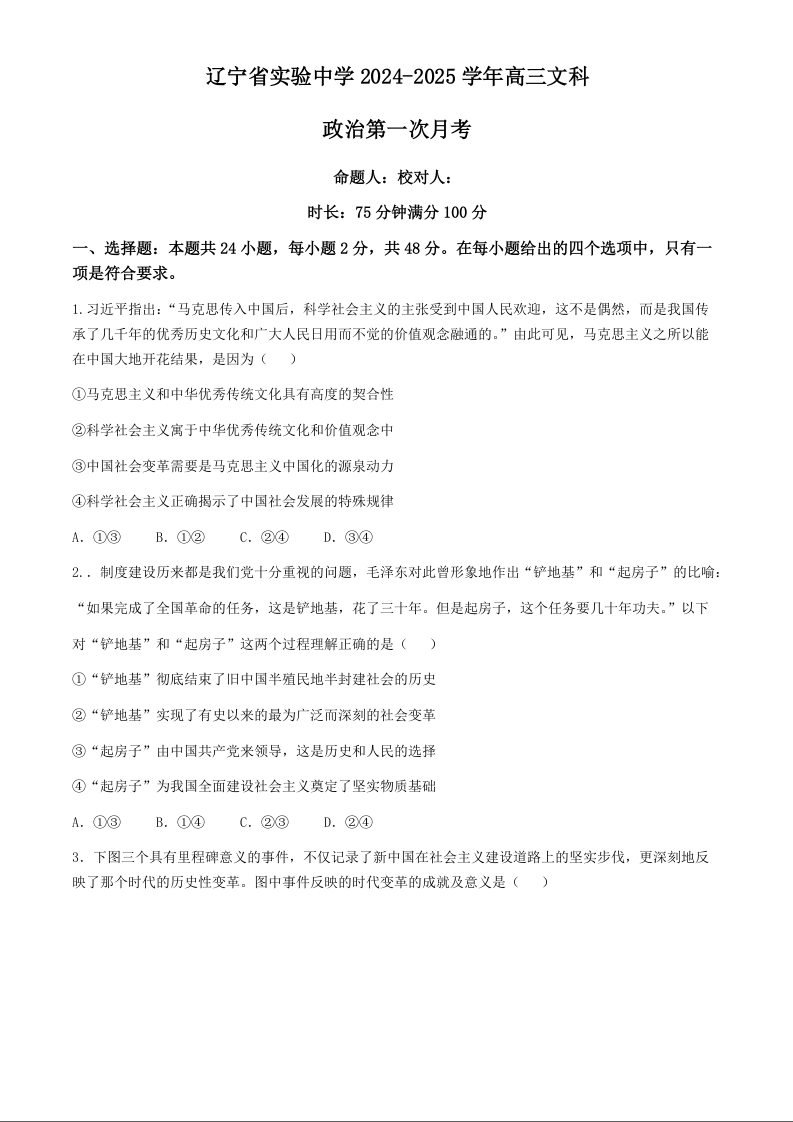 辽宁省实验中学2025届高三上学期第一次月考+政治