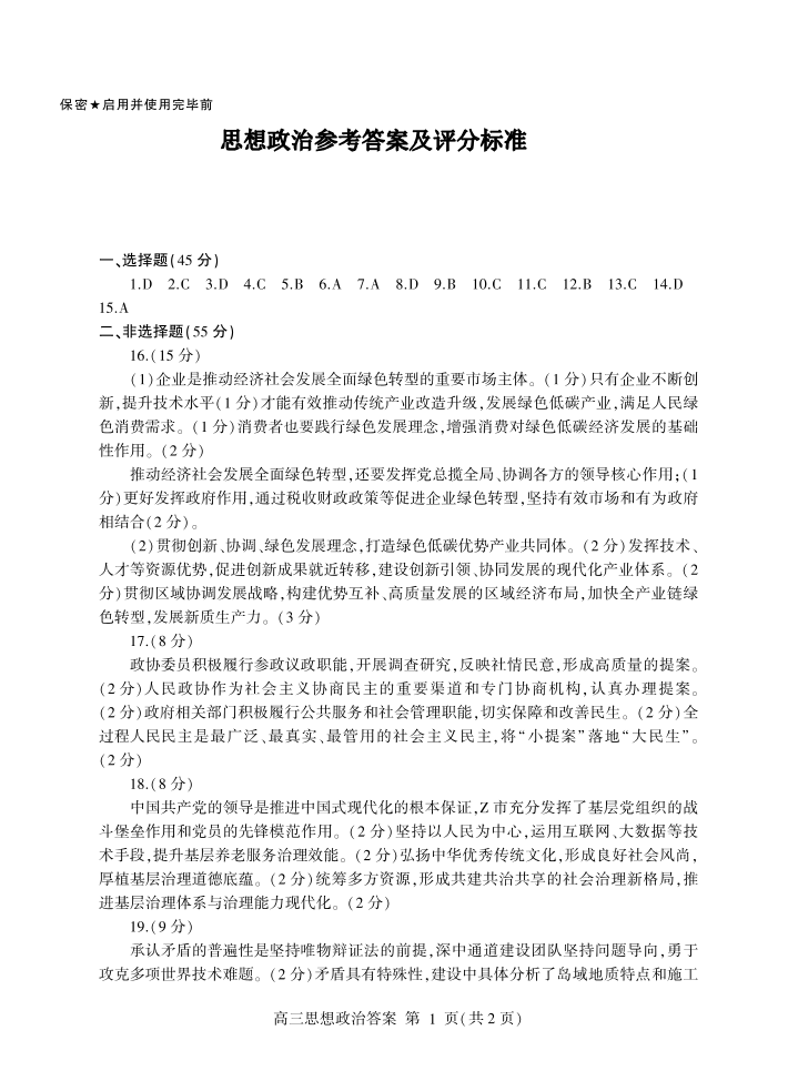 临沂市2024.11高三年级期中教学质量检测考+政治答案