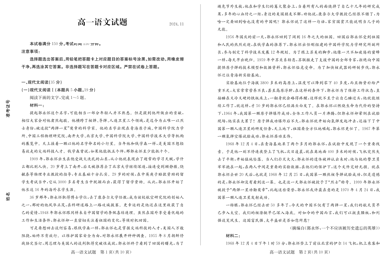 山东省德州市2024.11高一年级期中统一检测试题语文