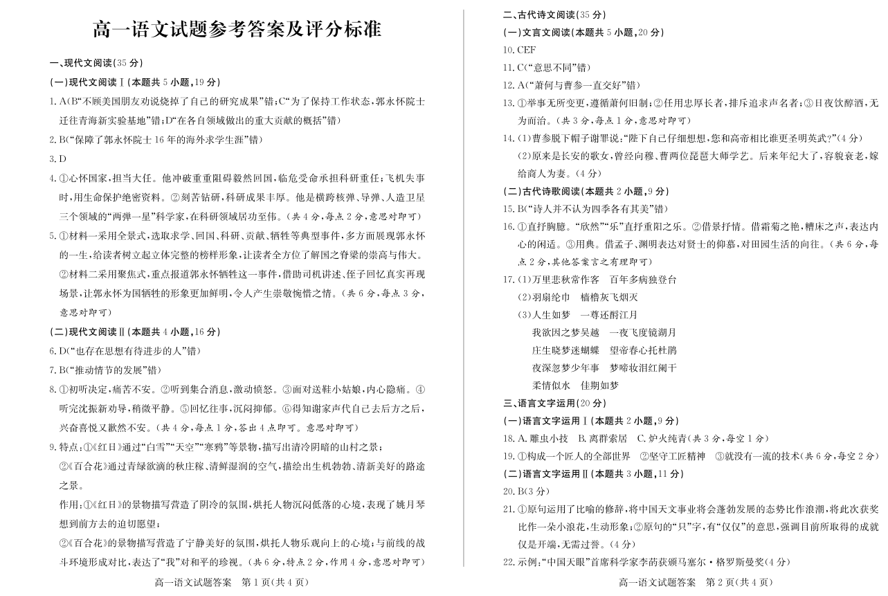 山东省德州市2024.11高一年级期中统一检测试题语文答案