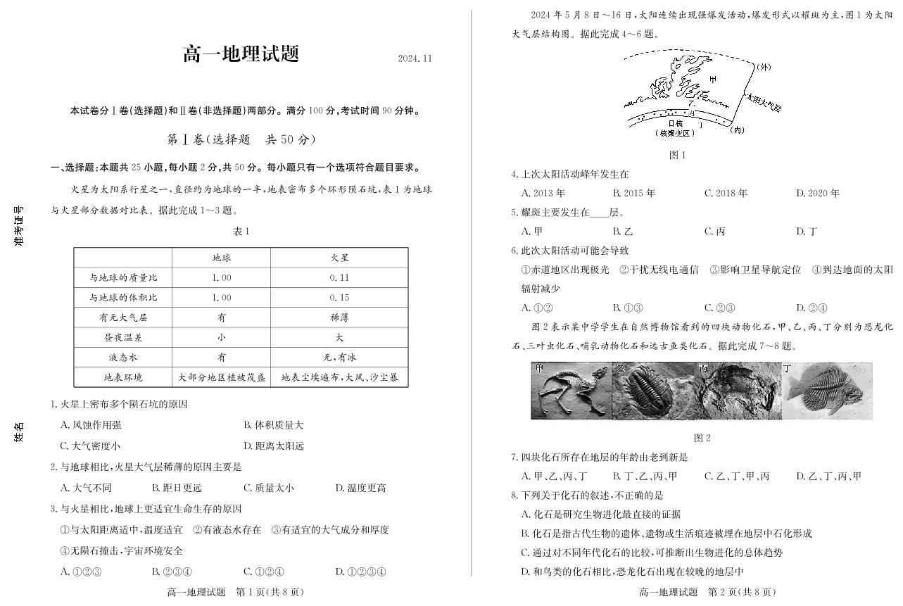 山东省德州市2024.11高一年级期中统一检测试题地理