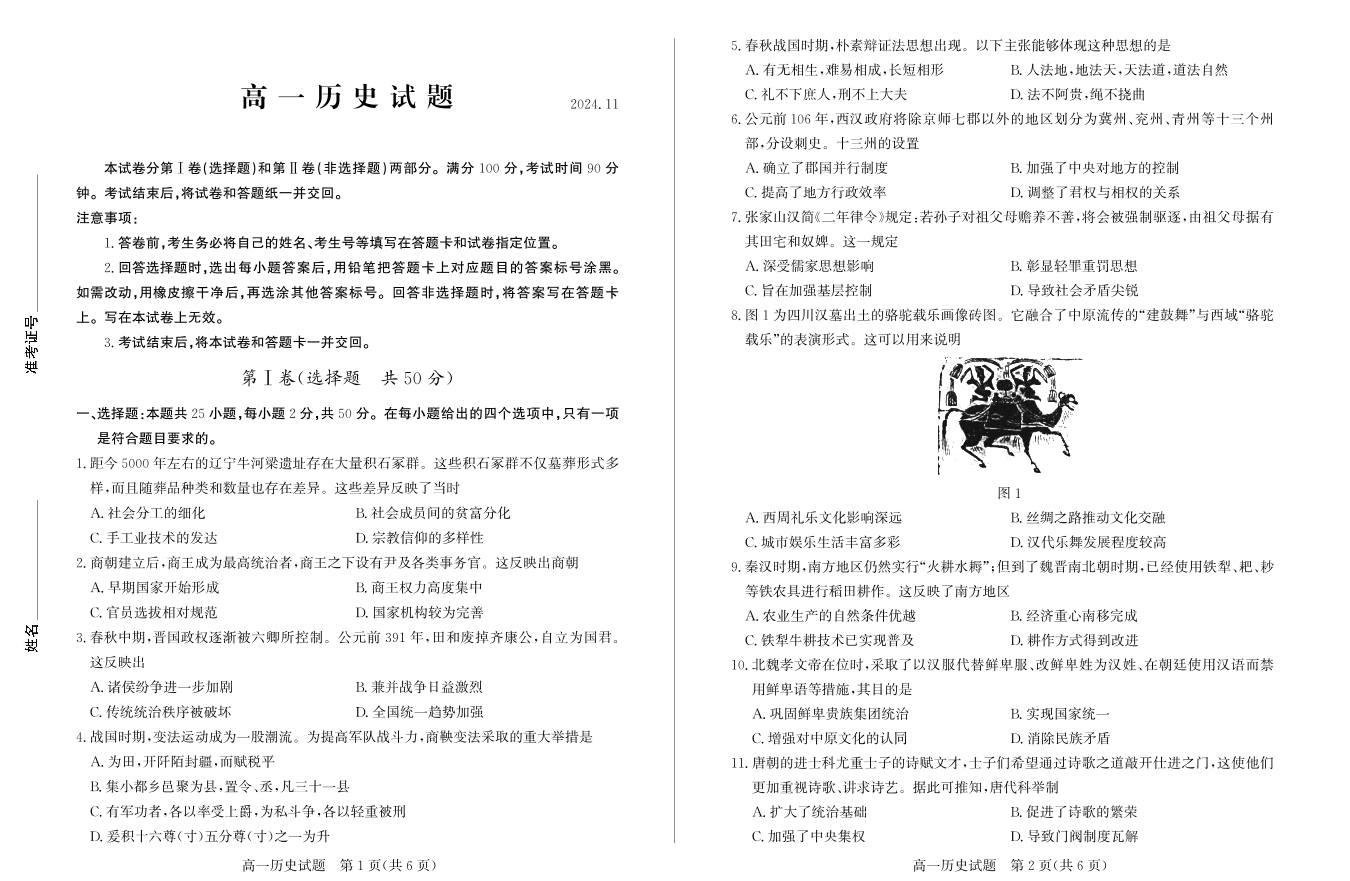 山东省德州市2024.11高一年级期中统一检测试题历史