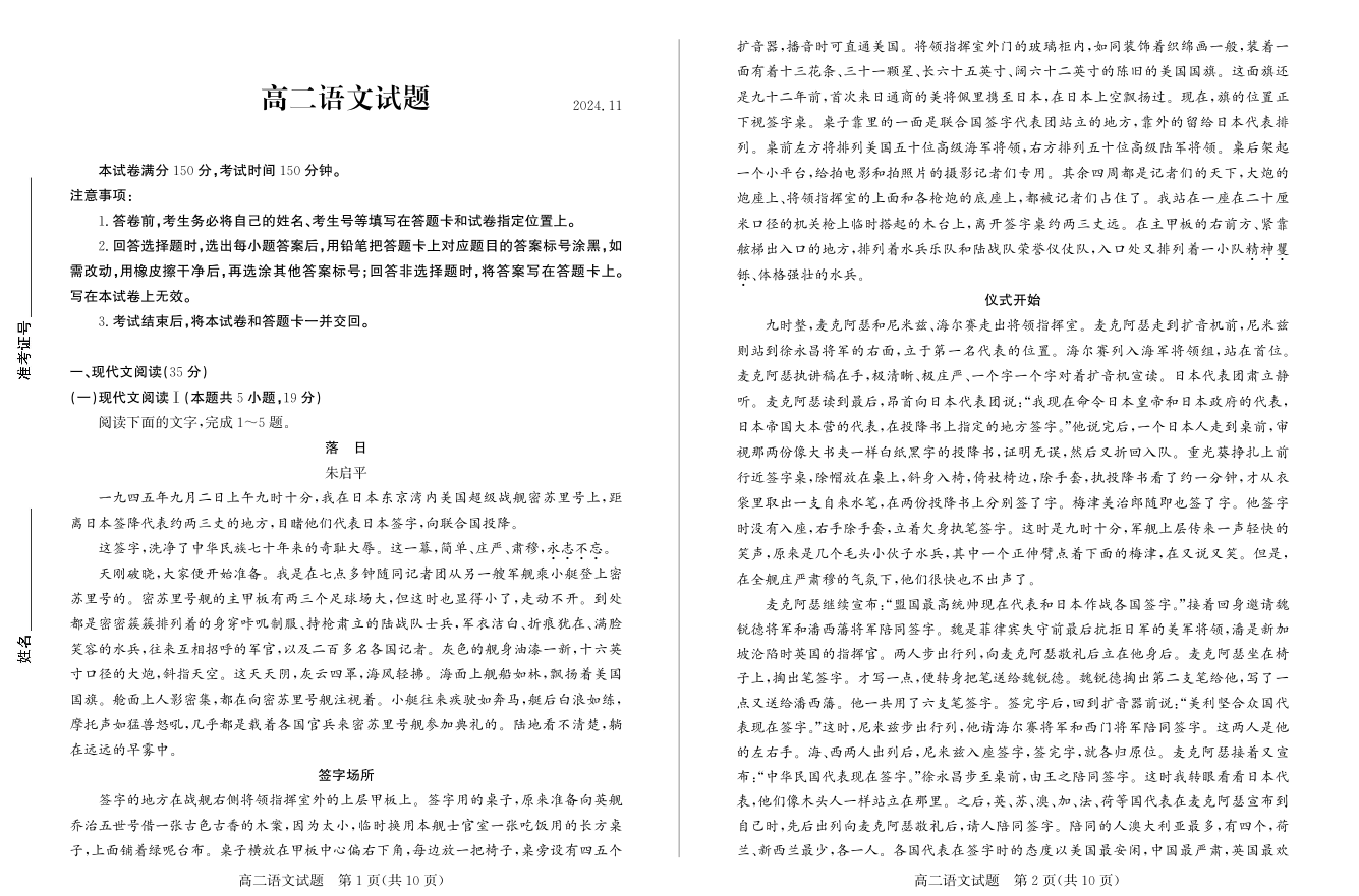 山东省德州市2024.11高二年级期中统一检测试题语文