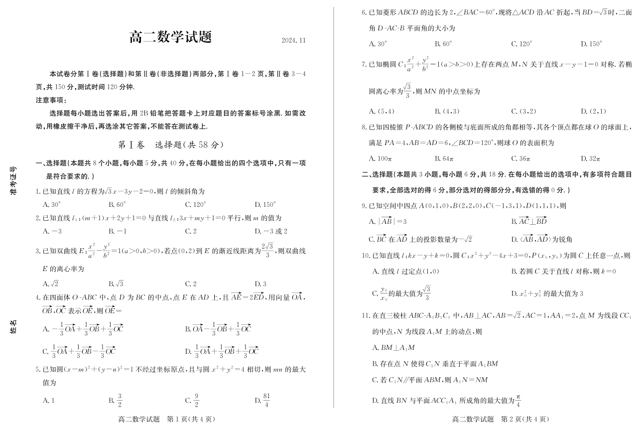山东省德州市2024.11高二年级期中统一检测试题数学