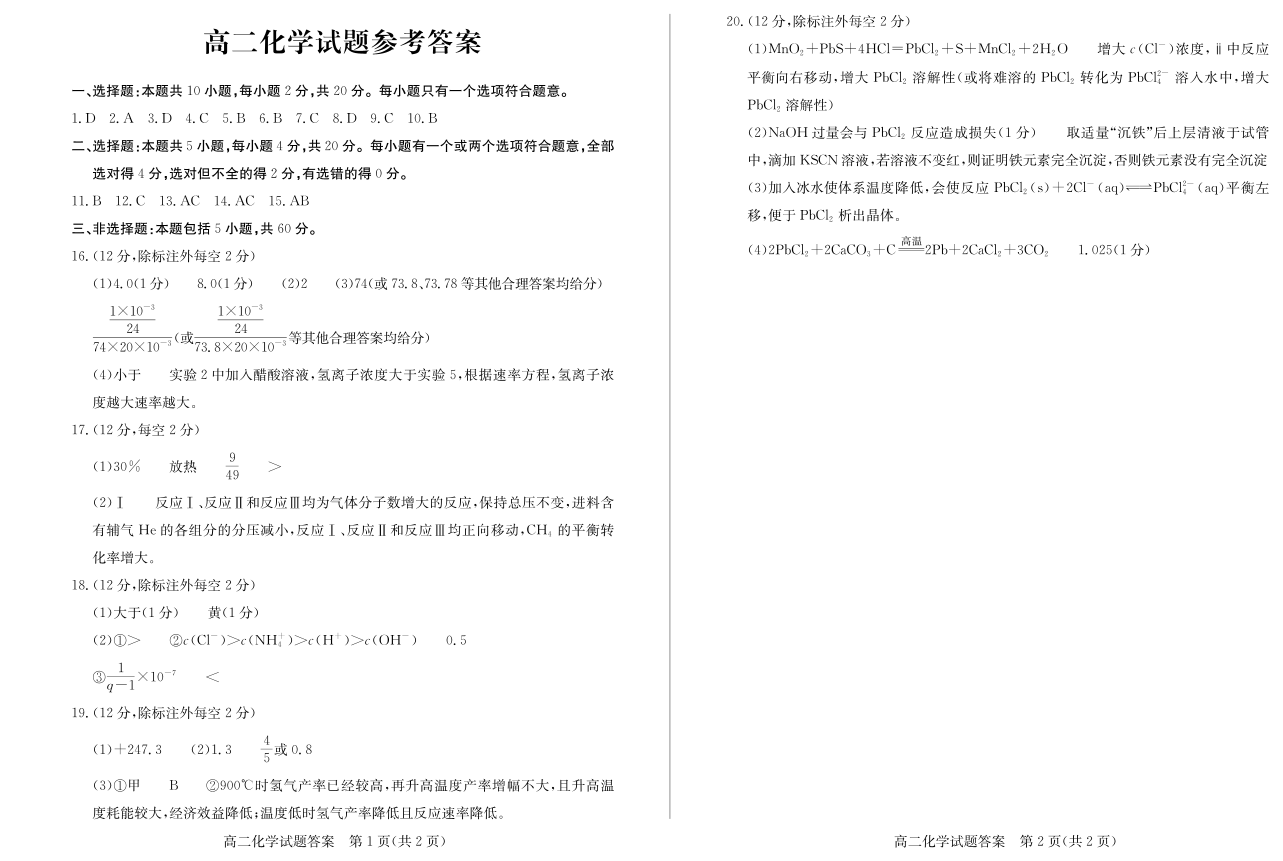 山东省德州市2024.11高二年级期中统一检测试题化学答案