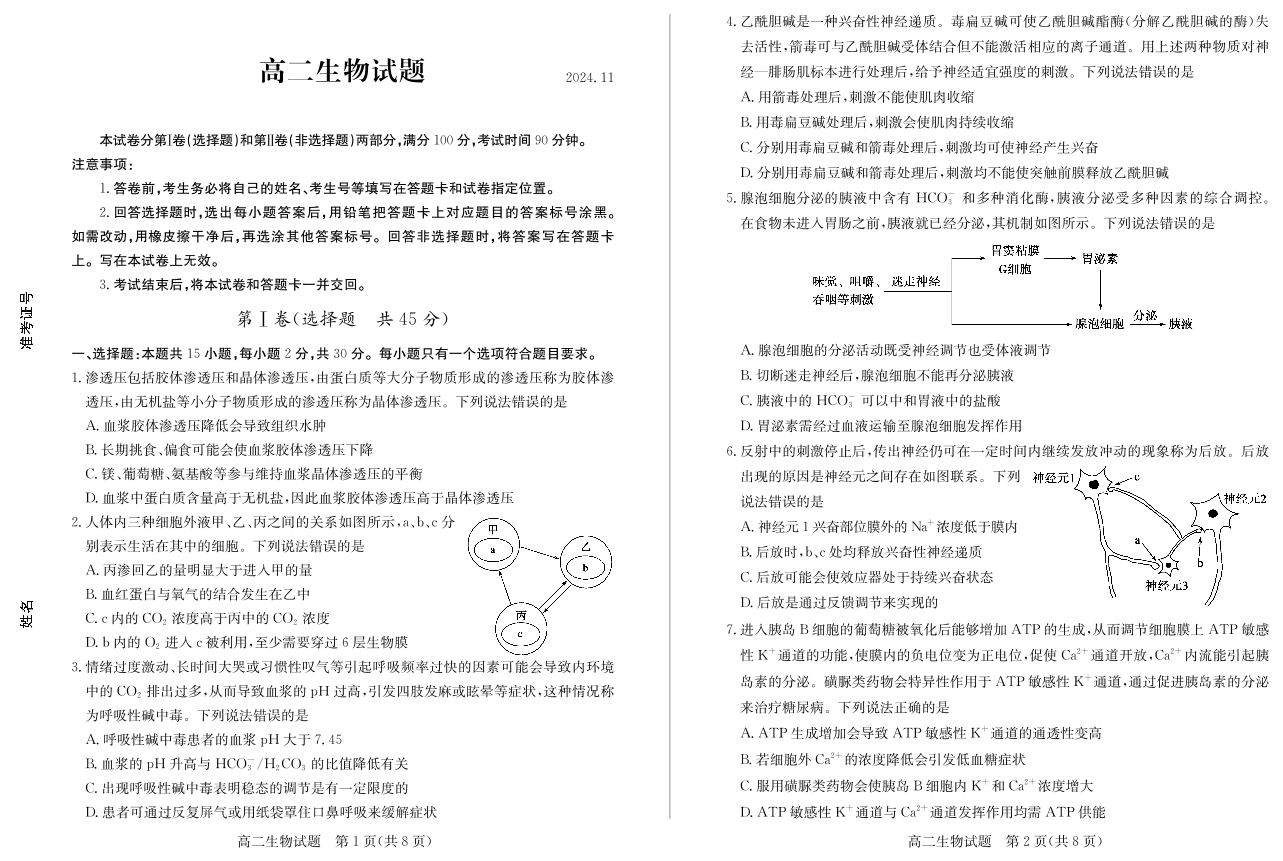 山东省德州市2024.11高二年级期中统一检测试题生物