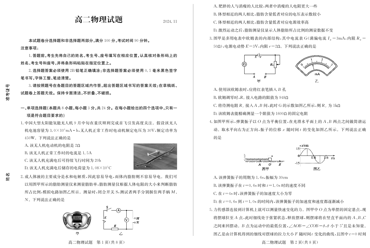 山东省德州市2024.11高二年级期中统一检测试题物理