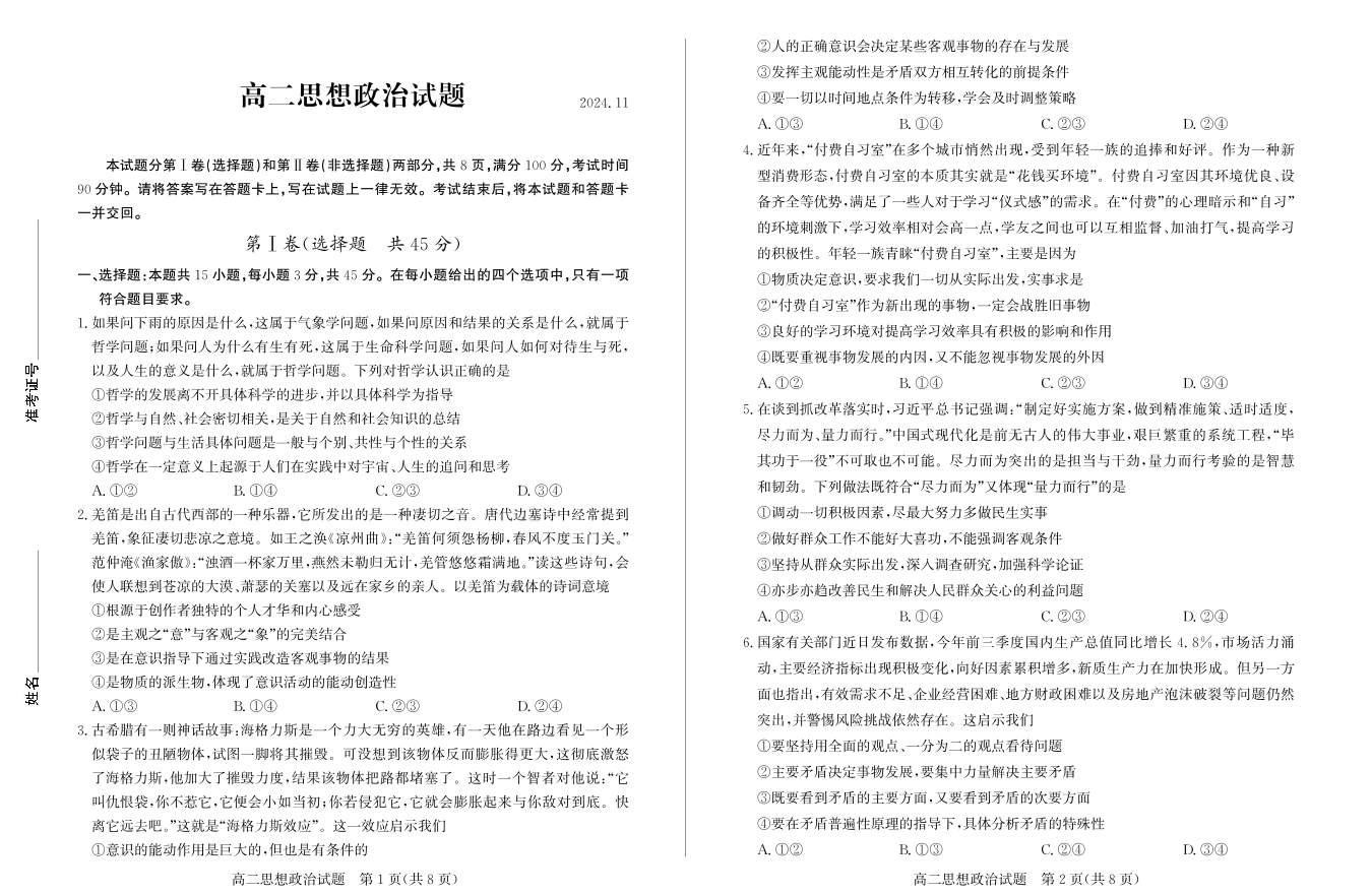 山东省德州市2024.11高二年级期中统一检测试题政治