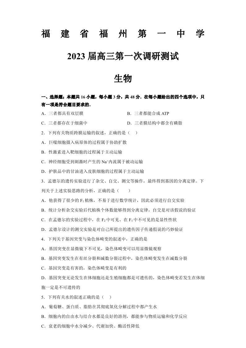 福建省福州第一中学2022-2023学年高三上学期第一次调研测试生物