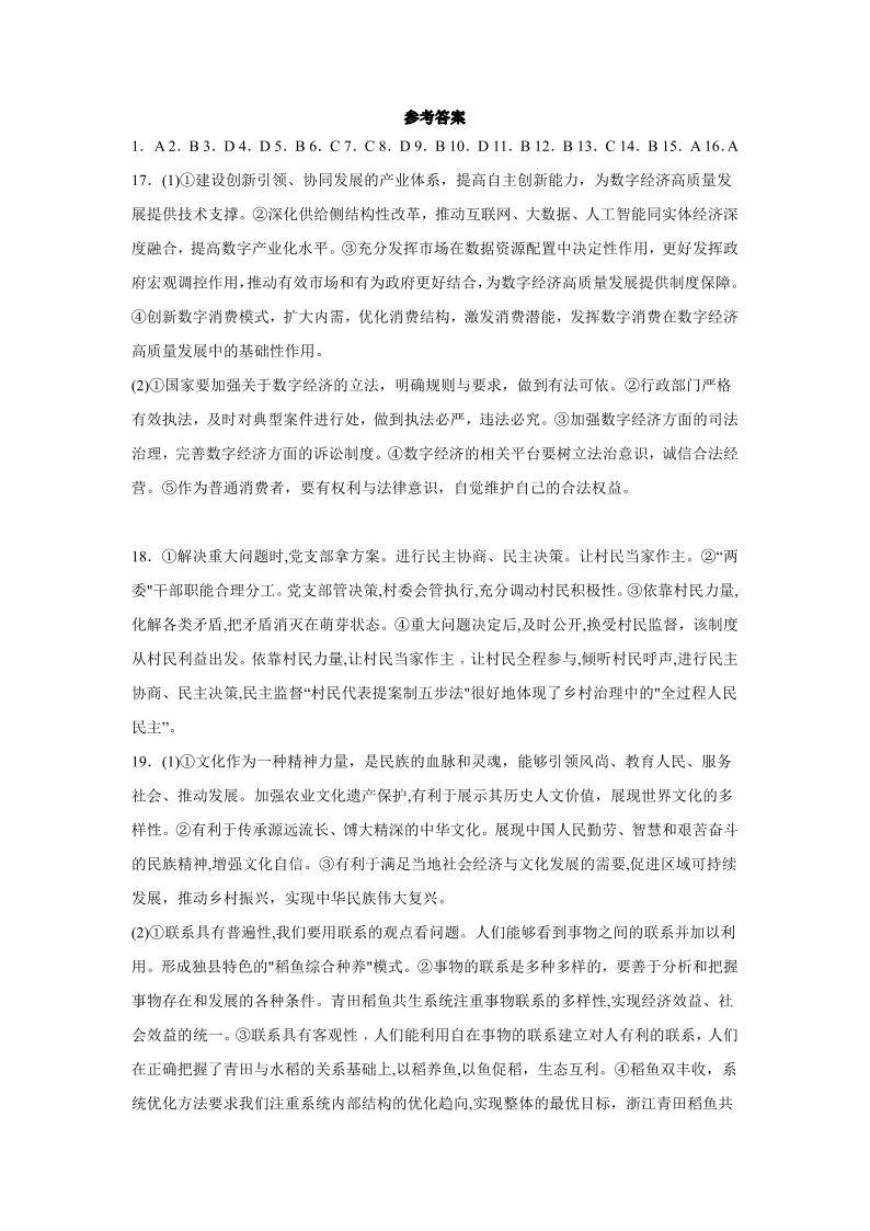 福建省福州第一中学2022-2023学年高三上学期第一次调研测试政治答案