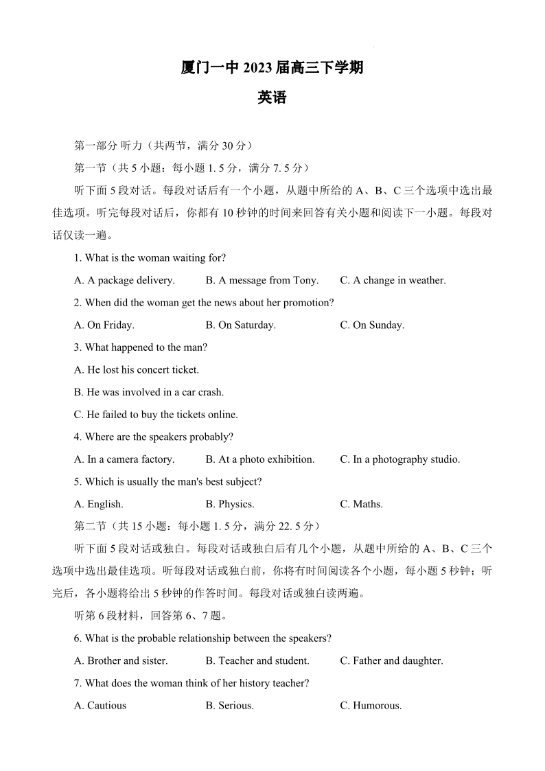 福建省厦门第一中学2022-2023学年高三下学期一模英语试题
