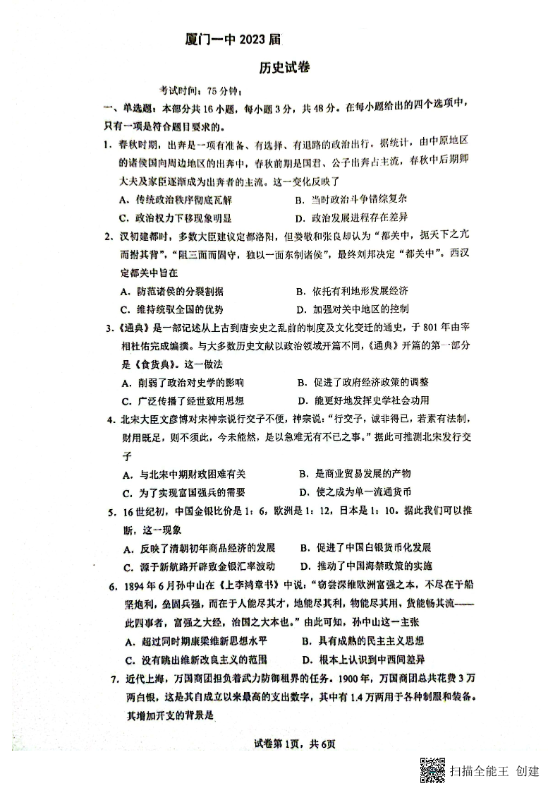 福建省厦门第一中学2022-2023学年高三下学期一模历史试题