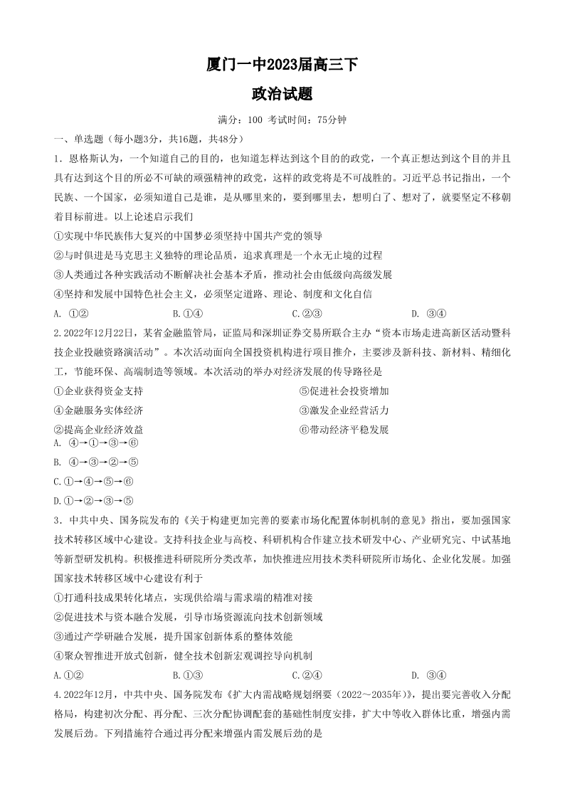 福建省厦门第一中学2022-2023学年高三下学期一模政治试题