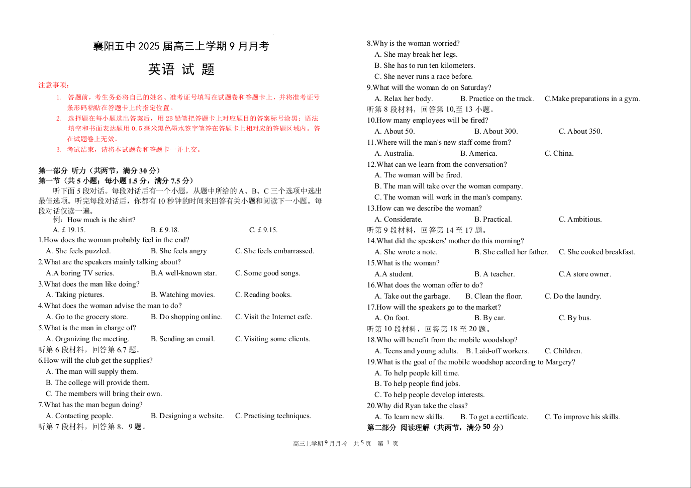 湖北省襄阳市第五中学2024-2025学年高三上学期9月月考+英语