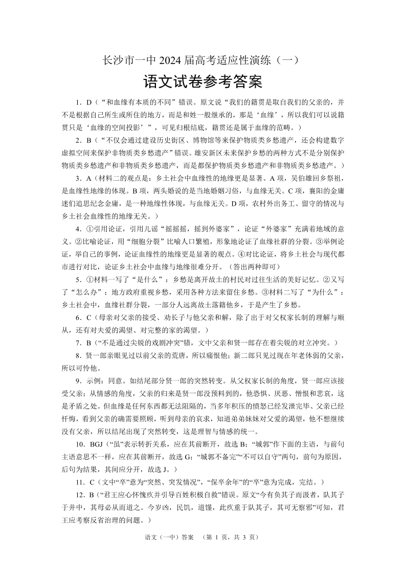 2024届湖南省长沙市第一中高三下学期高考适应性演练(一)语文答案