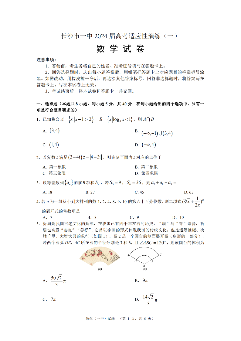 2024届湖南省长沙市第一中高三下学期高考适应性演练(一)数学