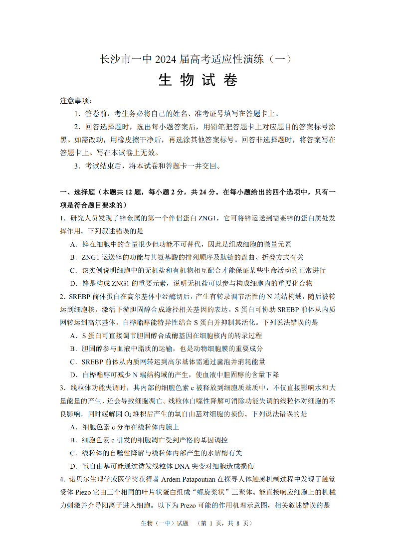 2024届湖南省长沙市第一中高三下学期高考适应性演练(一)生物