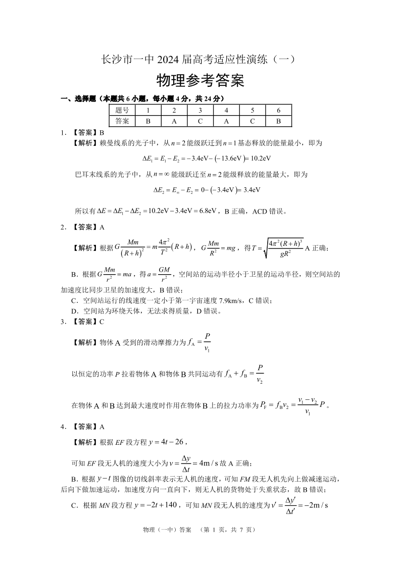 2024届湖南省长沙市第一中高三下学期高考适应性演练(一)物理答案