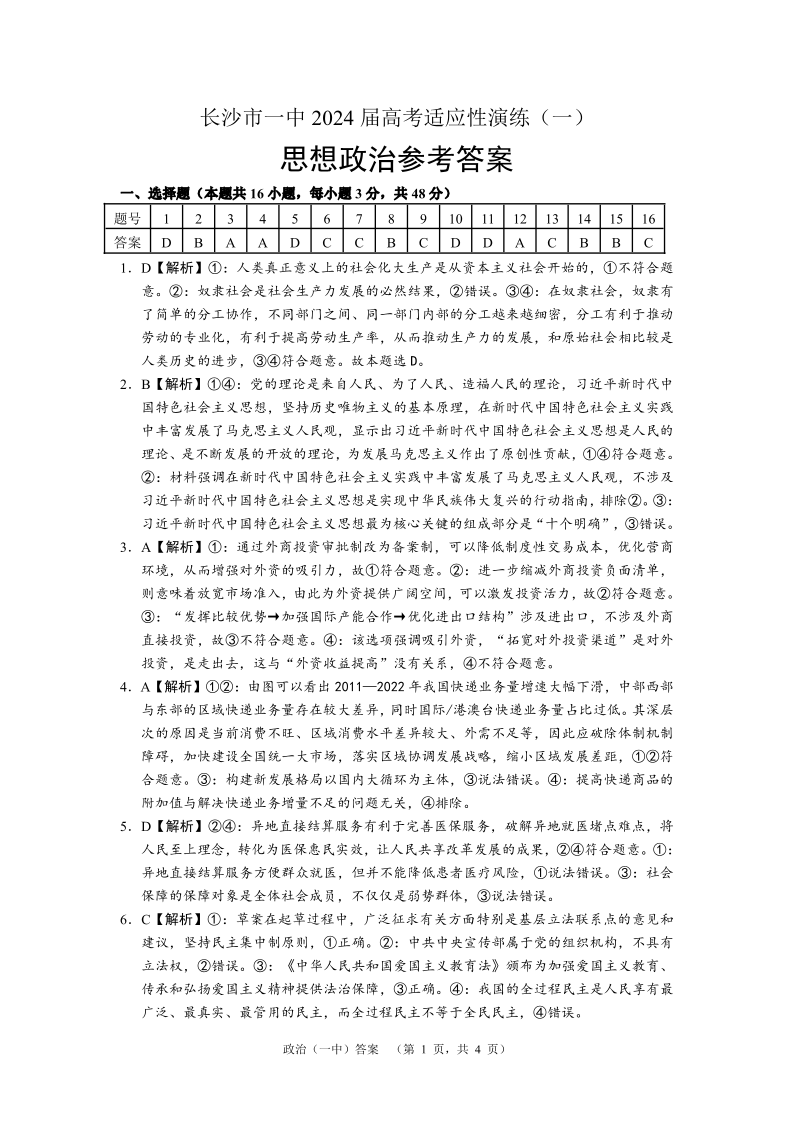 2024届湖南省长沙市第一中高三下学期高考适应性演练(一)政治答案