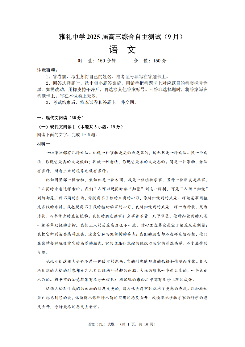湖南省雅礼中学2025届高三综合自主测试(9月)+语文