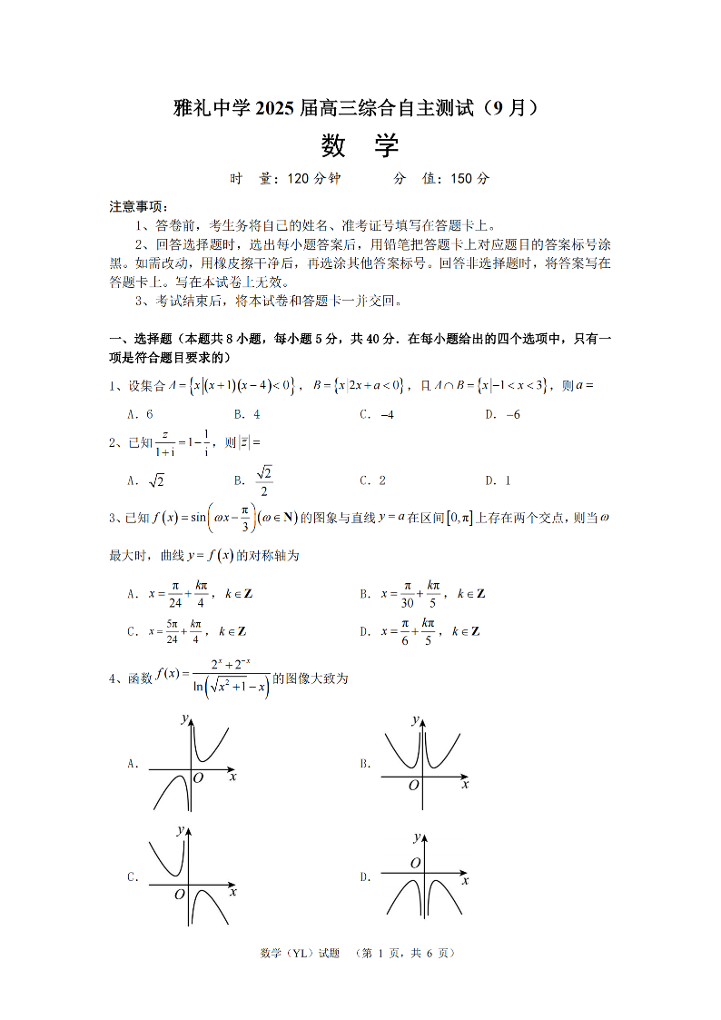 湖南省雅礼中学2025届高三综合自主测试(9月)+数学
