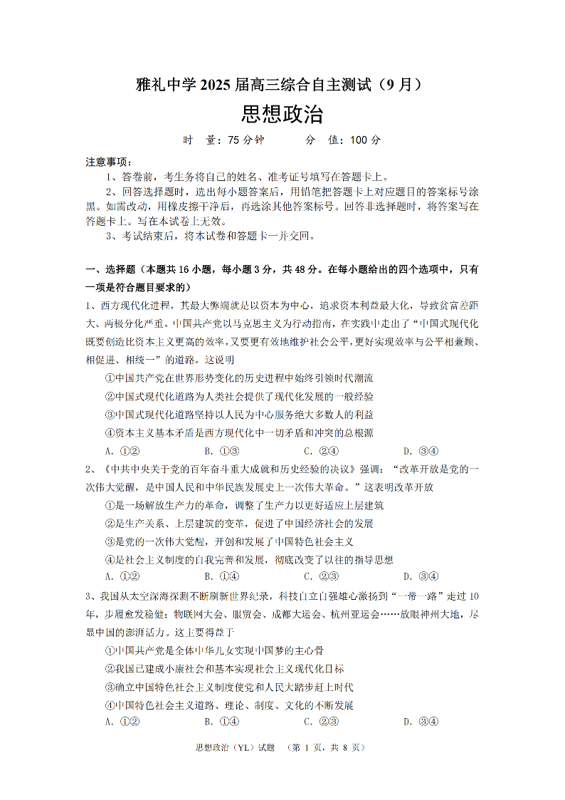 湖南省雅礼中学2025届高三综合自主测试(9月)+政治