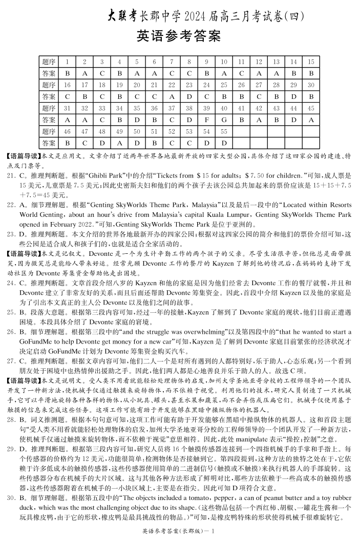 湖南省长沙市长郡中学2023-2024学年高三上学期月考(四)英语答案