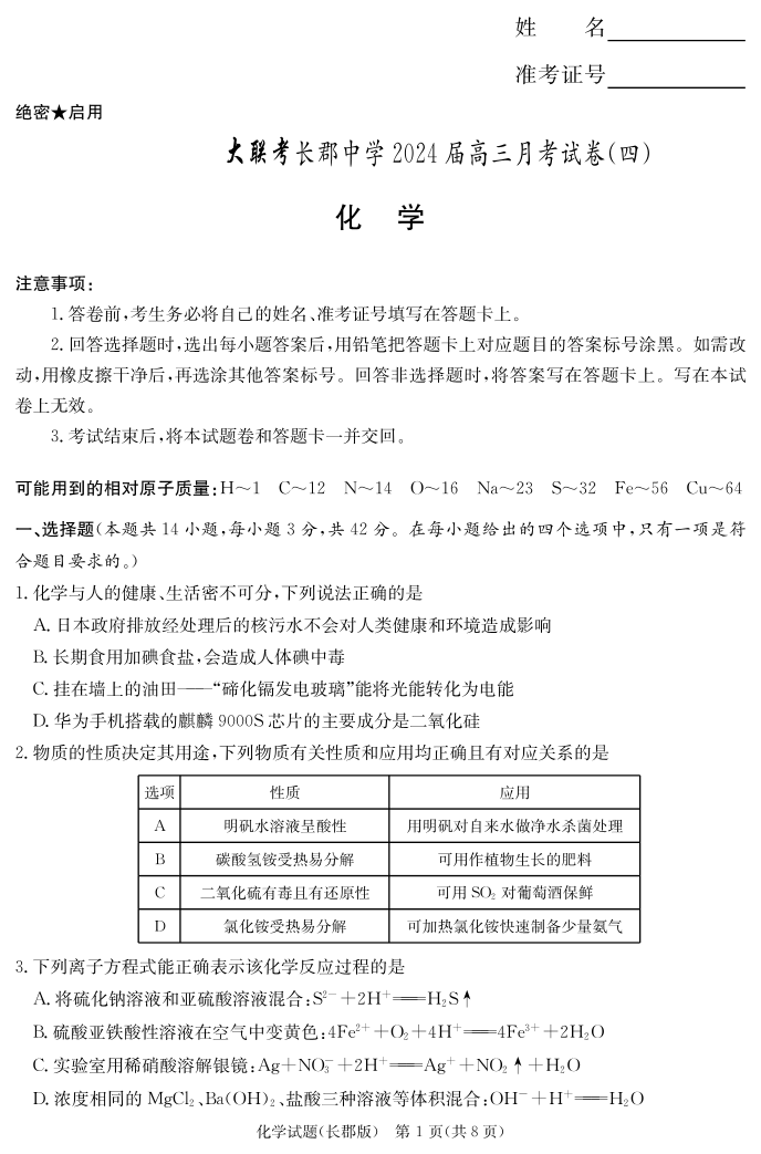 湖南省长沙市长郡中学2023-2024学年高三上学期月考(四)化学