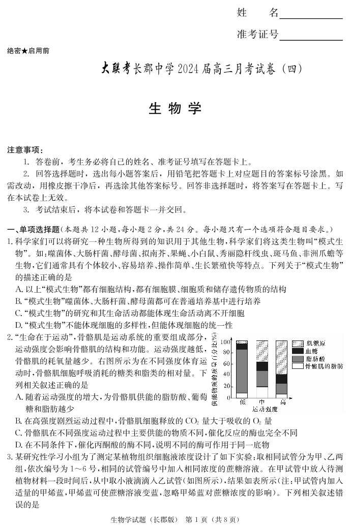 湖南省长沙市长郡中学2023-2024学年高三上学期月考(四)生物