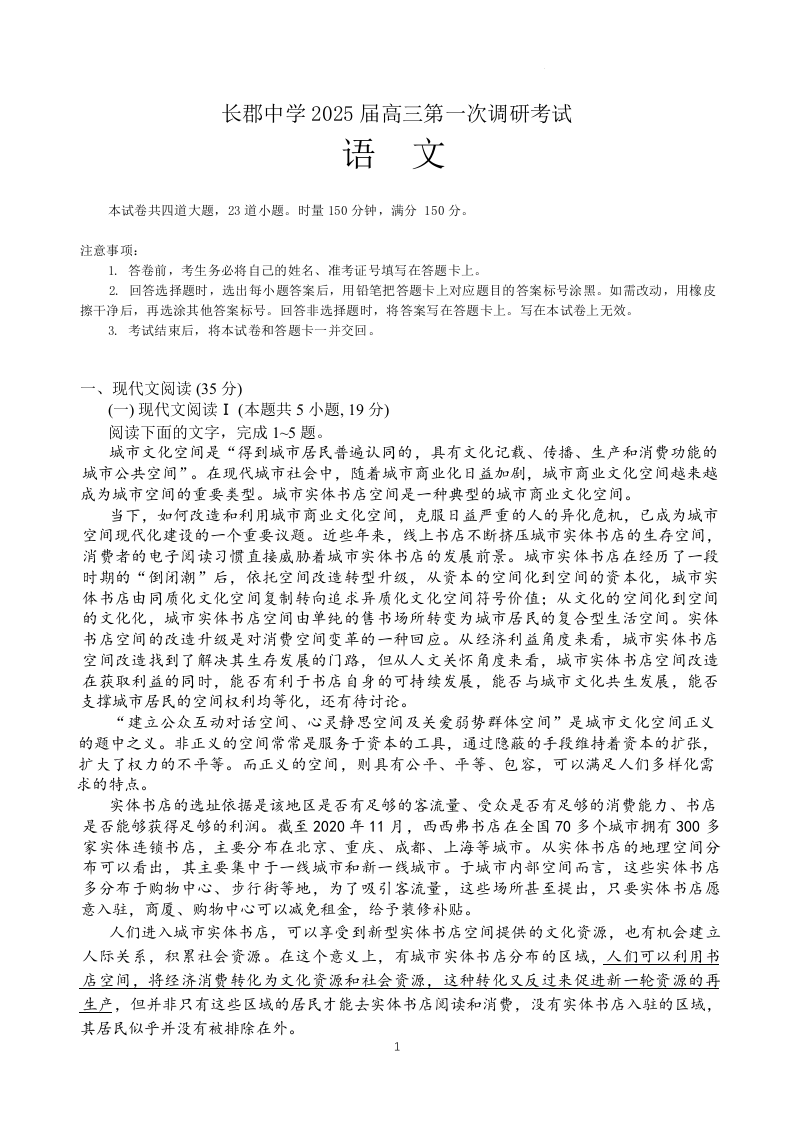 湖南省长郡中学2025届高三第一次调研考试+语文