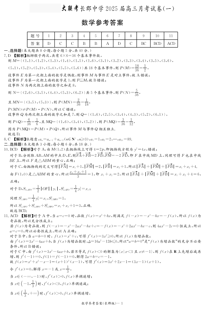 湖南省长郡中学2025届高三年级月考试卷(一)数学答案